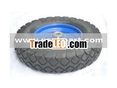 Detailed description 1.Size:16''x4.00-8 2.Tire material: Solid polyurethane 3.Rim type:Plasic rim with ball bearings 4.PU weight:2.1kg 5.Load capacity:150kg Puncture proof wheel |